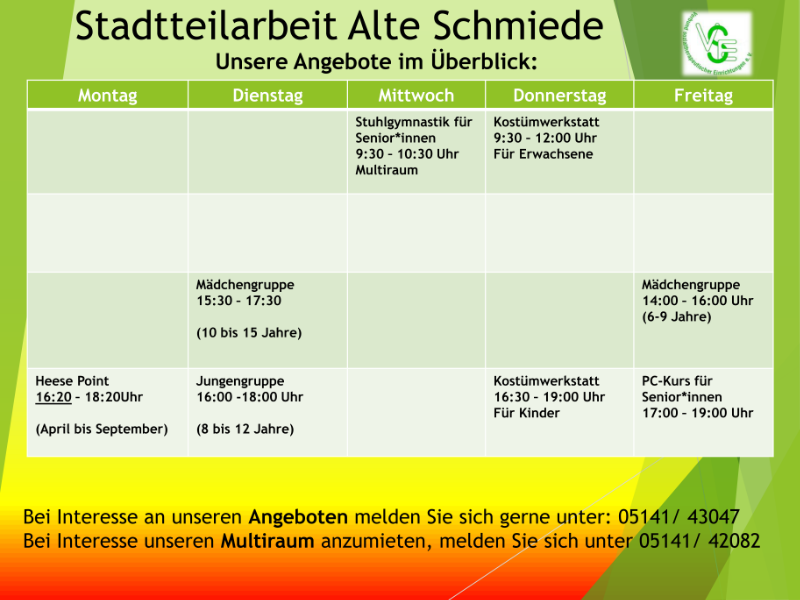 Im Rahmen unserer sozialräumlichen Arbeit gibt es in der Alten Schmiede verschiedene kostenlose Gruppenangebote. Unregelmäßig bieten wir Ausflüge, Feiern und Ferienprogramme, sowie die Möglichkeit, sich sozialpädagogisch beraten zu lassen.